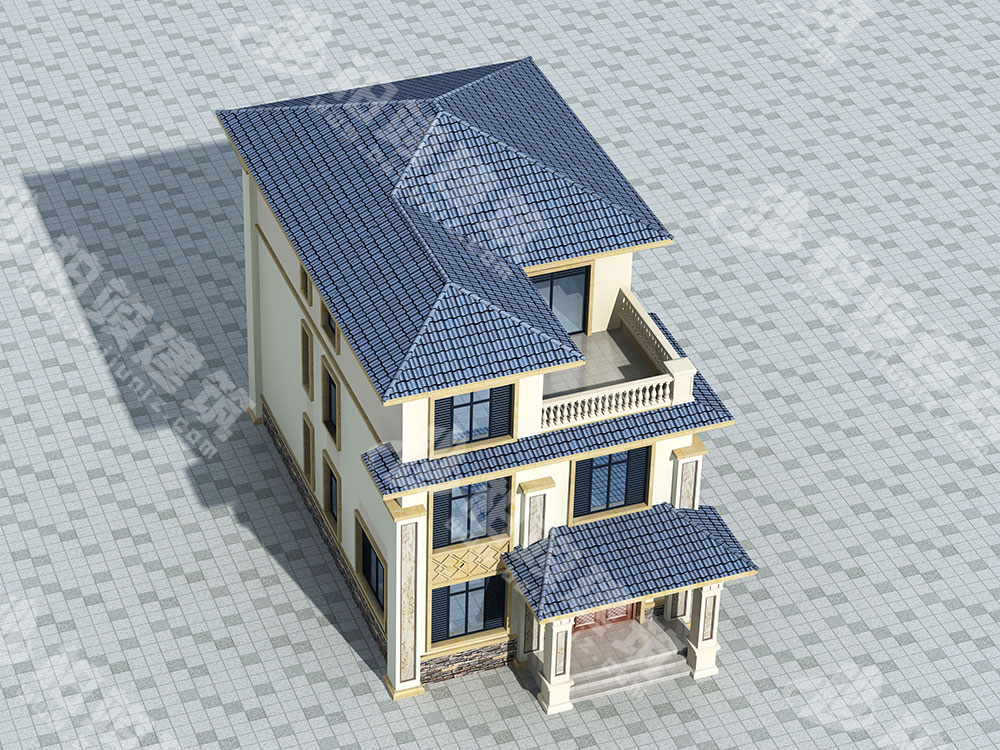 屋顶造型:灰蓝色釉面瓷瓦装饰坡形屋顶,光泽熠熠,清新时尚